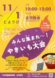 古河教会は、赤ちゃんからシニアの方まで、幅広い年齢層の人がいて、どなたでも、ゆつたりとくつろぎながら過ごせるアットホームな雰囲気の教会です。どうぞお気軽にご来会ください。