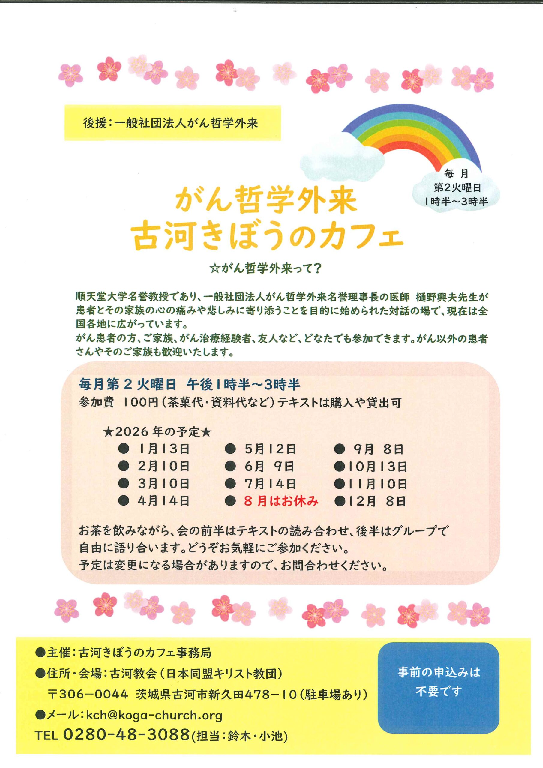 毎月第2火曜日 午後1時30分~3時30分まで 古河きぼうのカフェを開催しております。がん患者や家族、支援者などの対話の場です。予約は特に必要ありません。お問合せなどがある場合は、どうぞお気軽にご連絡ください。